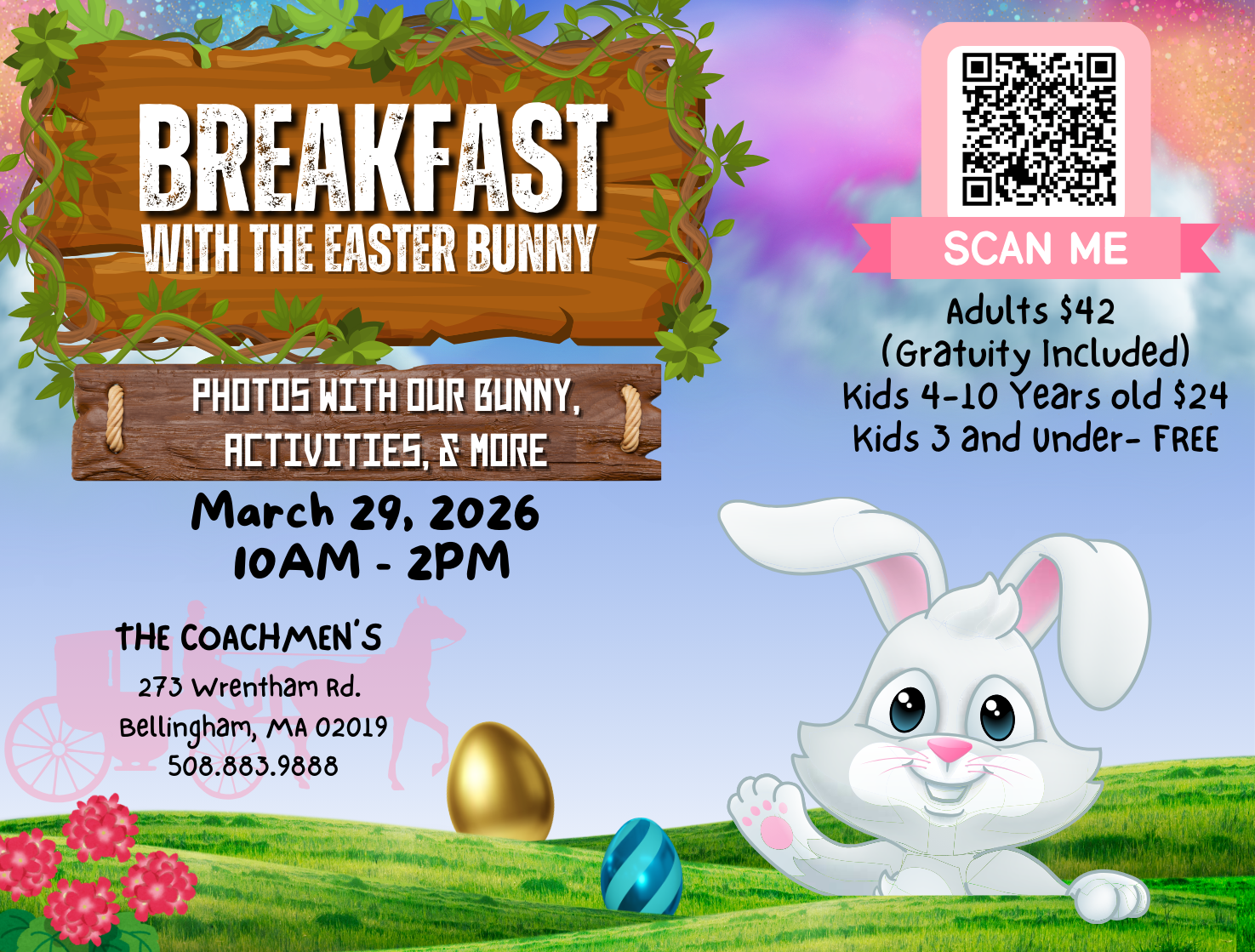 Join us March 29 10am–2pm for a Bunny Breakfast at Coachmen’s! Enjoy brunch, photos with the Bunny and fun activities for the whole family